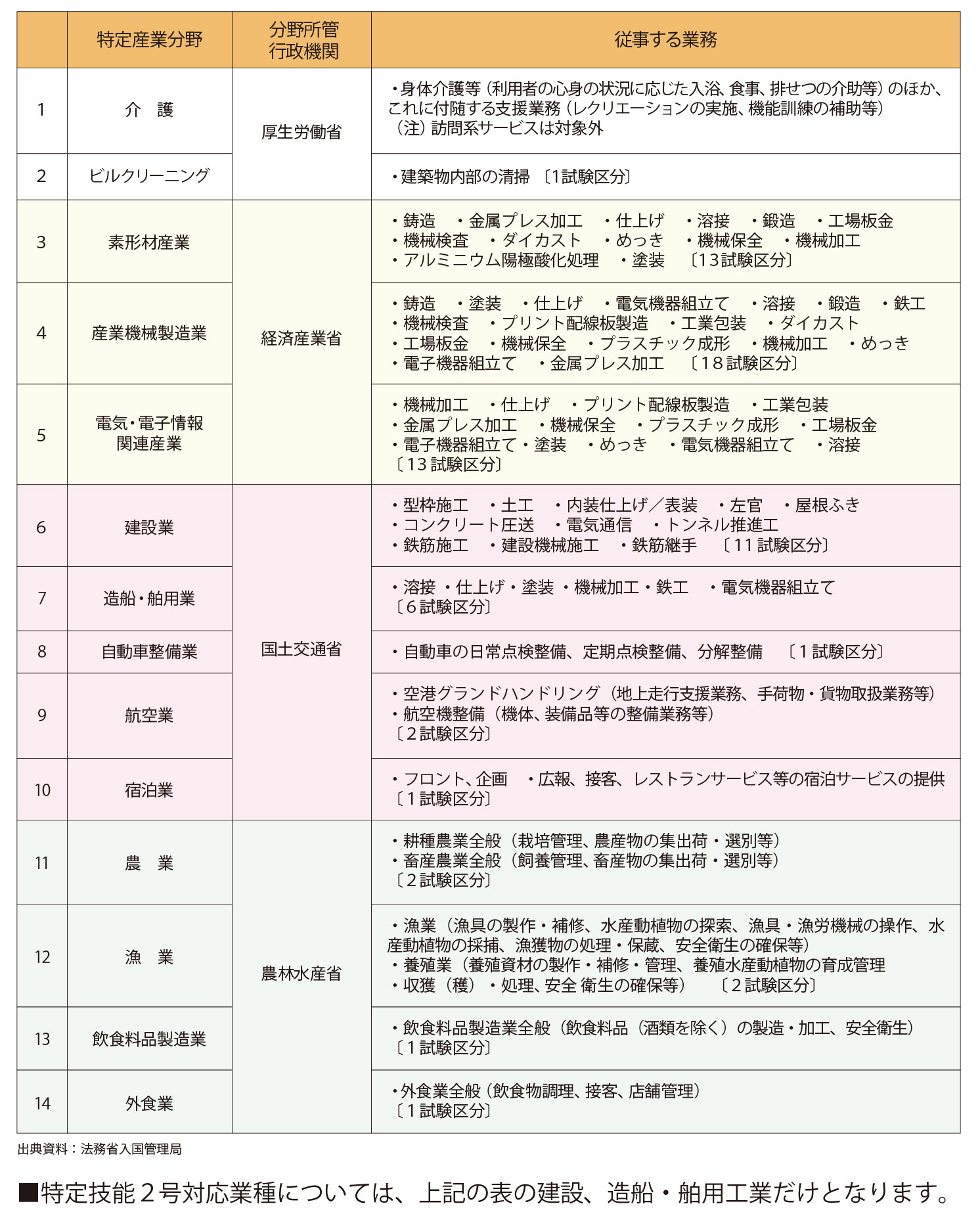 基本的には特定技能1号の修了者がその次のステップとして進む 在留資格で、熟練レベルの能力をもつ人材の確保を目的としています。現在は、14業種のうち、建設と造船の二業種だけが対象となる予定で、在留資格「特定技能2号」の取得者は期間更新に制 限がなく、永住の要件である日本滞在10年の要件をクリアする可能性が出てきます。